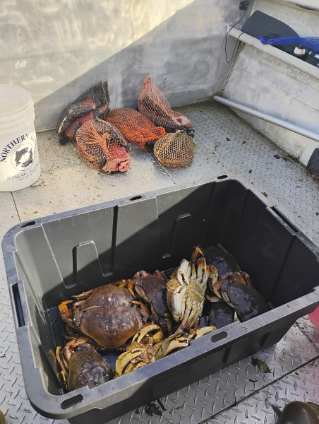 The day turned gorgeous, with the temperature in the 50’s and sunny when we launched the boat and headed for our pots. After we got the first pot in, I took on the jobs of baiting the bags for the next pots and tending the line hauler while the other two pulled the pots over the side and sorted the crab. The bait was fire red spawner coho salmon from the local hatchery. What a treasure this hatchery is to this side of the island. After decades of low returns and shoestring funding, the local aquaculture association took over the facility. Now the the returns can sometimes top 100,000 fish, which are shared by commercial trollers, charter fishers, and personal use harvest by residents.