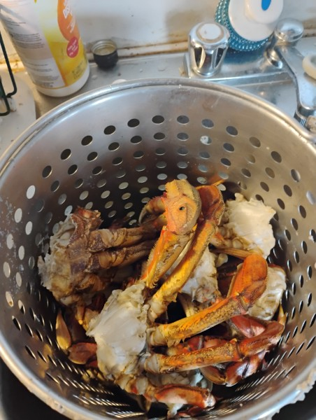 Brian dropped me off at our place, and 7 crab from the tote filled my 5 gallon bucket. Dungeness crab are about the easiest seafood to catch, clean and cook, but one of the most tedious to extract what you’re after. You start out with a bucket full of critters, and when the shells are all shucked, and you eat your fill, you  have a few  bags of meat leftover to vacuum pack and freeze. Of course, it is dungeness crab, so it’s worth it.