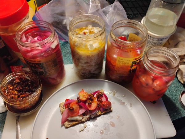 I had a bunch of pickling solution left from canning the crab apples, so I used some to pickle a couple red onions in a big Mama Lil’s jar. I filled another Mama Lil’s jar with crab and poured more pickling solution.  This morning, I had a Wasa cracker with the crab, Mama Lil’s, the pickled onions, and Rik’s chili oil. That did the trick again.