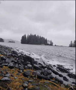 The next morning I took a route to the meat sacks from the beach nearest the tug. It was a more gradual climb that the steep hill where I went yesterday, and took me through some new country. I took my gun just in case a wandering bear was on the meat, per Kurt’s advice. I was up and back by 10 am, just as it started to rain and blow. I was back in town about 1 pm. I got home and the meat sacks hung in the shed.