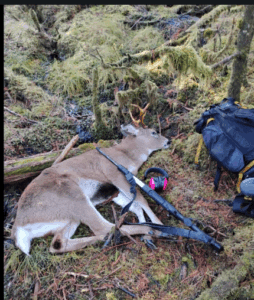 I left town the next morning before sunrise and it took an hour and half to motor to an anchorage we use a lot in the summer fishing. I’ve never hunted the hill behind the anchorage before, but we saw a huge buck swim there in Septermber. I called at a few places, but as I suspected from looking at my Onx app, there aren’t muskegs where I was hunting. I’d be hunting in the timber. Finding a good spot with the ability to see very far was tough. I eventually worked my way to the top of the hill and found there was a small open bowl that I could see maybe 50 yards at the furthest. The spot looked like it had two or three potential trails leading to it. I wasn’t going over the top of the hill and down the other side – this was it for the day. I heard lots of shooting down the channel. I called my normal pattern of call, count to 600. Call, count to 500. Call, count to 400. All the way down to call, count to 100. I was about consigned I wasn’t going to see a deer today, but it was a great day and I got a good hike in and saw brand new country. I was surprised I hadn’t seen a single deer, and although there were nice size tracks, I saw no fresh deer scat. I had plenty of time as it wasn’t yet 11 am, so after the normal calling sequence, I decided to try something different. I made more frequent calls and tried to sound like a whiny 2 year old who wanted his mom to pick him up and hold him. I heard something that was out of the ordinary, and saw movement just below me. Then I saw it was a deer body. Then the head. Ooo. A nice fork horn, 10 yards away. I dropped the ear muffs, safety off, and now to start processing.