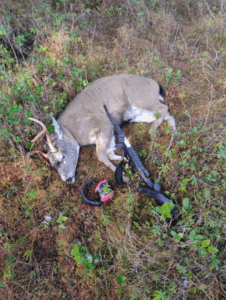 I called again awhile later, and see a doe walking the same trail as the buck. She also didn’t seem to care I was there or come over to me, but just kept working her way the same as the buck. Then a fork horn buck popped his head up 20 yards from me in the brush. He gave me time to drop the ear muffs propped on my head, get a rest, and make a neck shot. Dang, it’s been a long time since I got a deer. It was 9 am.