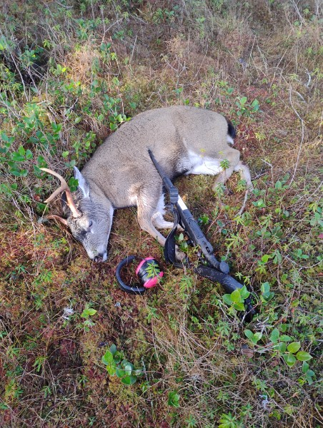 I never was quite sure today if I was going to the “right” place I went to on the other hunts, but tried to keep from going down the wrong hill that might not lead where I wanted to go. The Onx app is quite the technology. It’s sort of like seeing a deer call work that first time- I never go hunting without it, and would be at a loss if I did. Onx is the same. I called at a couple spots in big timber where I could see a good ways. After calling at the second spot, I looked downhill and – oooh- that’s what I’ve been looking for. A muskeg I hadn’t noticed til now. Just as I got down to level ground to sit down and call at the edge of the muskeg I saw movement- I was busted. A doe nervously started walking away. Oh. And she’s got a boyfriend. I tweeted lightly on the call, and that just made her move faster. I stood still for a few moments to see if they might come back, then slowly crept along to the direction the pair had headed. And there was Romeo, who stuck around to see if he might find another girlfriend. I dropped my pack and got a rest and jacked a shell in the chamber. Only, I didn’t need to. There already was a shell in the chamber. Well, Romeo didn’t like that, and he walked out of sight. I crept up to see better, and they were gone. Cool! My first chance of the year. I only got one chance all of last year. I think I always choke on the first buck of the year. Just a little rusty, and you learn for the next one.