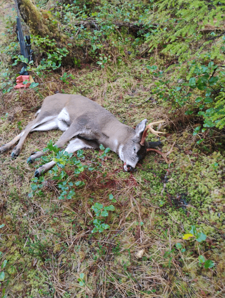 I left town the next morning before sunrise and it took an hour and half to motor to an anchorage we use a lot in the summer fishing. I’ve never hunted the hill behind the anchorage before, but we saw a huge buck swim there in Septermber. I called at a few places, but as I suspected from looking at my Onx app, there aren’t muskegs where I was hunting. I’d be hunting in the timber. Finding a good spot with the ability to see very far was tough. I eventually worked my way to the top of the hill and found there was a small open bowl that I could see maybe 50 yards at the furthest. The spot looked like it had two or three potential trails leading to it. I wasn’t going over the top of the hill and down the other side – this was it for the day. I heard lots of shooting down the channel. I called my normal pattern of call, count to 600. Call, count to 500. Call, count to 400. All the way down to call, count to 100. I was about consigned I wasn’t going to see a deer today, but it was a great day and I got a good hike in and saw brand new country. I was surprised I hadn’t seen a single deer, and although there were nice size tracks, I saw no fresh deer scat. I had plenty of time as it wasn’t yet 11 am, so after the normal calling sequence, I decided to try something different. I made more frequent calls and tried to sound like a whiny 2 year old who wanted his mom to pick him up and hold him. I heard something that was out of the ordinary, and saw movement just below me. Then I saw it was a deer body. Then the head. Ooo. A nice fork horn, 10 yards away. I dropped the ear muffs, safety off, and now to start processing.
