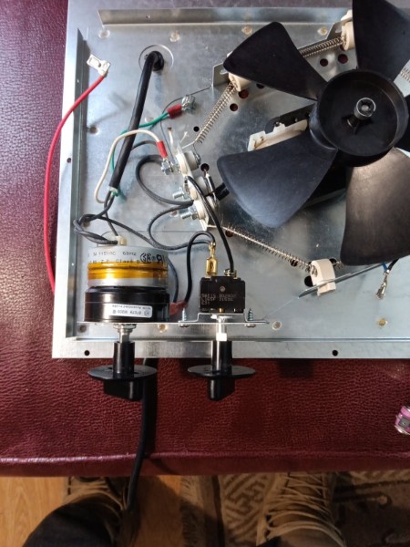I then started trying to figure out how else I could make it work. I looked into 110 V thermostats for things like toaster ovens or heating systems (stove and clothes dryer thermostats are common, but are 220V. They might work, but that’s above my skill level)….Then I thought: I have a bad toaster oven in the garage to go to recycle. I took out the temperature control thermostat from the toaster oven. I had to cut and splice some wires, drill new holes to mount it, etc in the guts of the dehydrator…. but it worked! And heat at full blast looks like it comes up to 165 F – same as it’s supposed to with the stock thermostat !. The shaft that holds the knob for the temperature control is far shorter for the toaster oven thermostat than the stock thermostat, so the female housing on the knob wasn’t long enough to reach it. I found some vacuum hose in the garage that goes over the shaft tight, and that works like a dream. Easy!